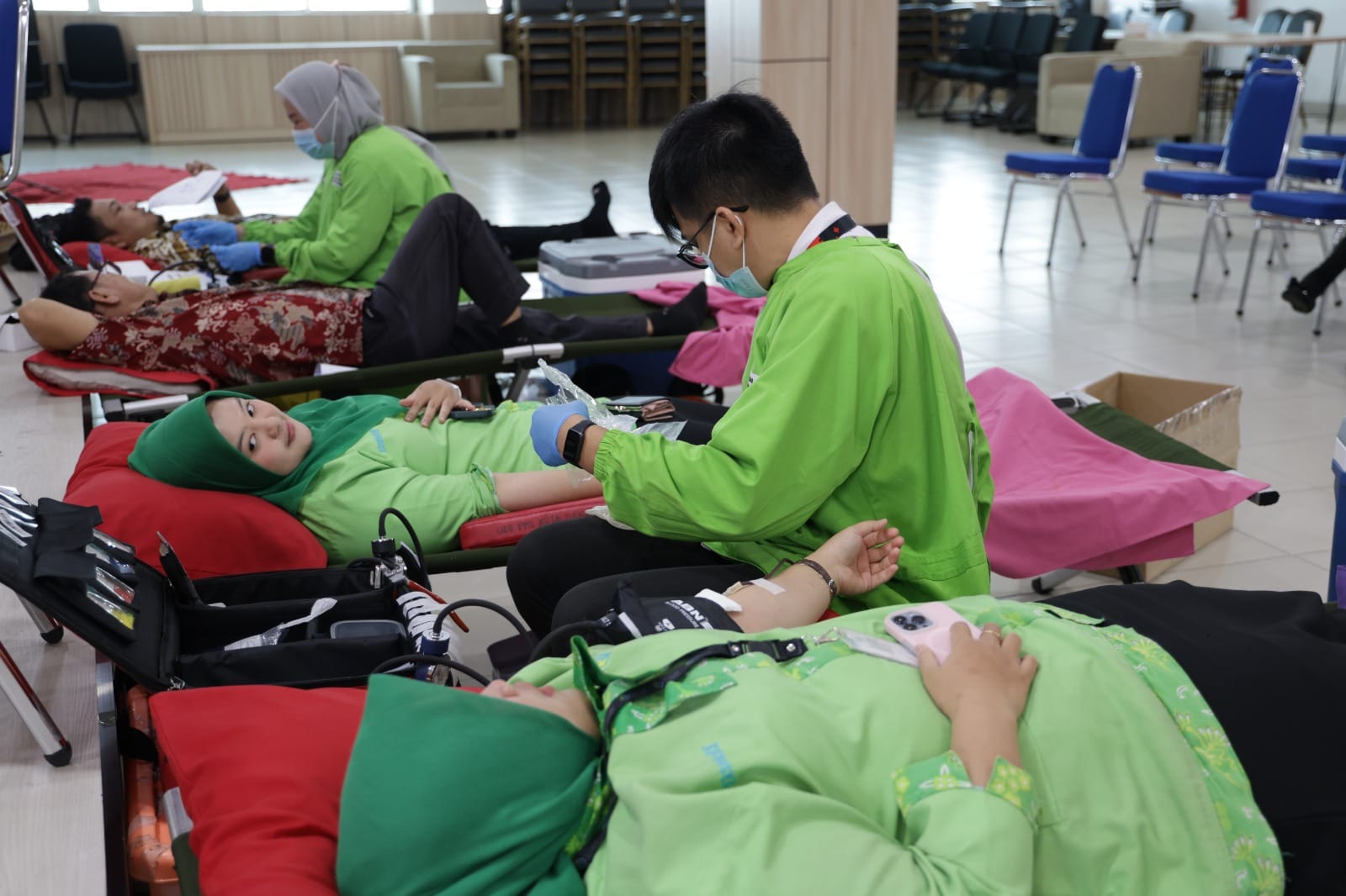 Berdasarkan pantauan di lokasi, para peserta tampak berbaring di tempat tidur donor dengan didampingi petugas medis berseragam hijau. Proses pengambilan darah dilakukan secara profesional dan mengikuti standar prosedur kesehatan. Suasana kegiatan terlihat hangat, mencerminkan kepedulian dan solidaritas antar sesama.